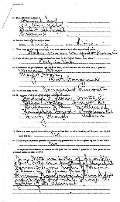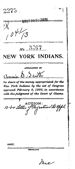 My favorite record group for tracking Native people in New England is housed in the National Archives down in Washington, DC. It’s part of Record Group 75 also known as the records of the Bureau of Indian Affairs. The pages known as 75.12.2 are the Records relating to Kansas claims of New York Indians. Below is the front page of one of the many records found in this group.