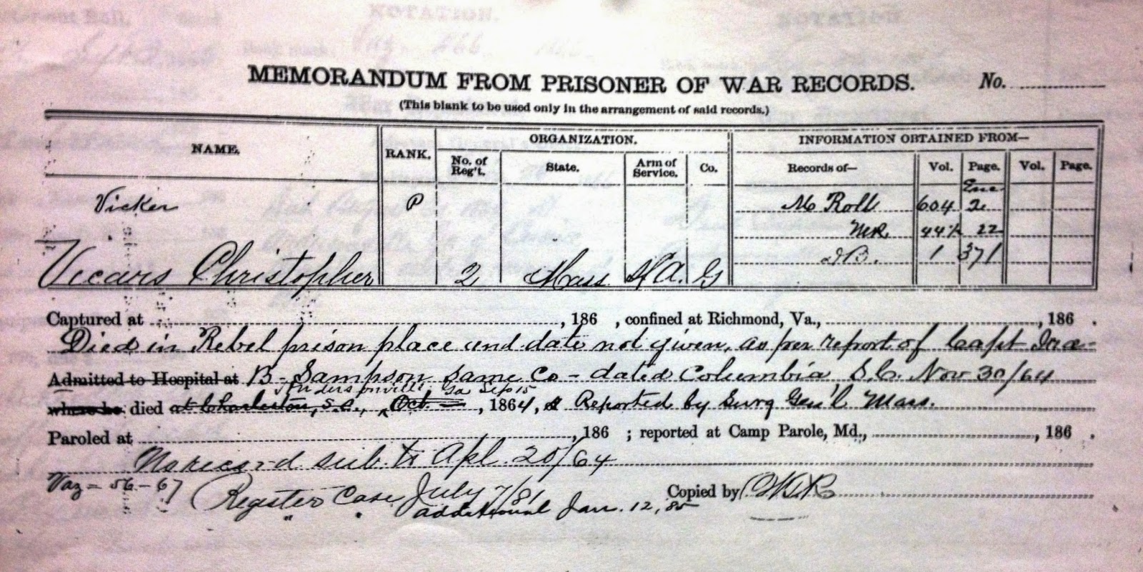 Christopher volunteered for Company G, 2nd Massachusetts Heavy Artillery on December 4, 1863. He was captured in Plymouth, North Carolina in April of 1864 and died while a prisoner of war. His military records each carry a variety of dates for his death- August 30, 1864 at Andersonville, Georgia, September 15, 1864 at Andersonville, and October 1864 in Charleston, South Carolina.