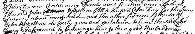 “Containing Twenty acres fourteen acres of which I the said John Hazeltine sell to the said Cesar Tony for the sum of money above mentioned and the other six acres I the said John Hazeltine do freely give and quitclaim to him the said Cesar Tony as aforesaid to Encourage him to be a good Husbandman”