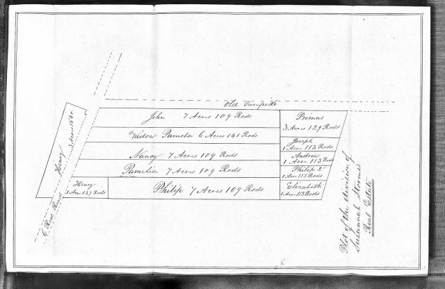 The Storms became one of the many free, land-owning Black families in Vermont. When Susannah died unmarried on 16 September 1845, she left her 54 acre “Home Farm” to her family. Her father, Primus and her brother Joseph had already passed on so Susannah’s estate was divided eight ways. Her mother and six living sibling each received 1/8 share of the land. The five children of her brother Joseph each received 1/5 of the last eighth of land. Below is the surveyor’s rendering of the division.
