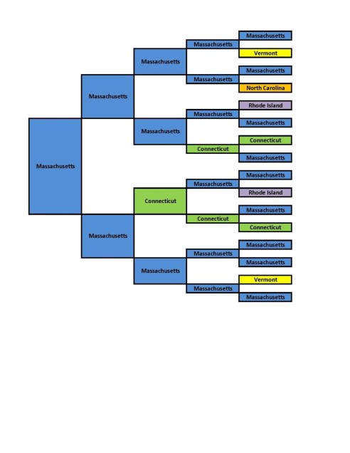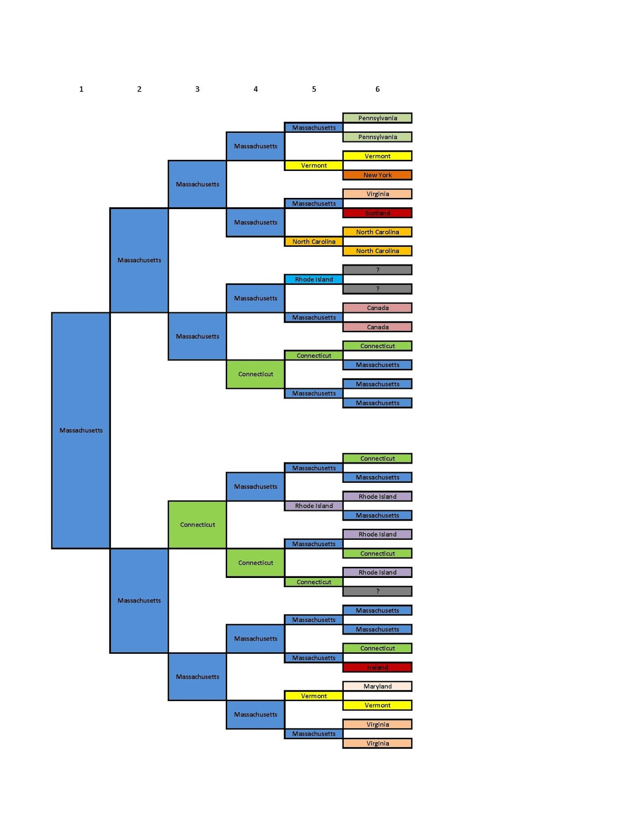 It seems like every genealogist on Facebook posted their version of the colorful Excel chart developed by Geneaspy blogger, J Paul Hawthorne. So without further ado, here’s my 5-generation Excel chart showing the birthplaces of myself and my ancestors. As you can see, I am a New Englander.